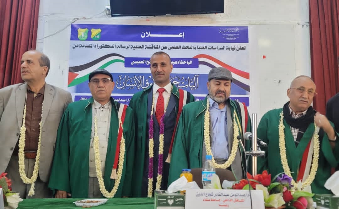 حصل الباحث عبده محمد صالح العميسي اليوم على درجة الدكتوراه بامتياز من كلية الشريعة والقانون –جامعة صنعاء، عن أطروحته الموسومة بـ ” آليات حماية حقوق الإنسان، دراسة فقهية مقارنة”.