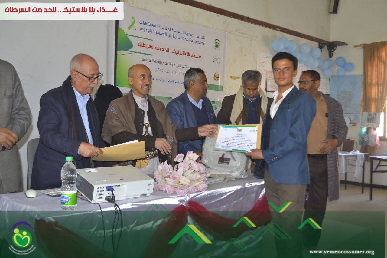 كرمت الجمعية اليمنية لحماية المستهلك وصندوق مكافحة السرطان المشاركين في المعرض التوعوي غذاء آمن بلا بلاستيك للحد من السرطان.