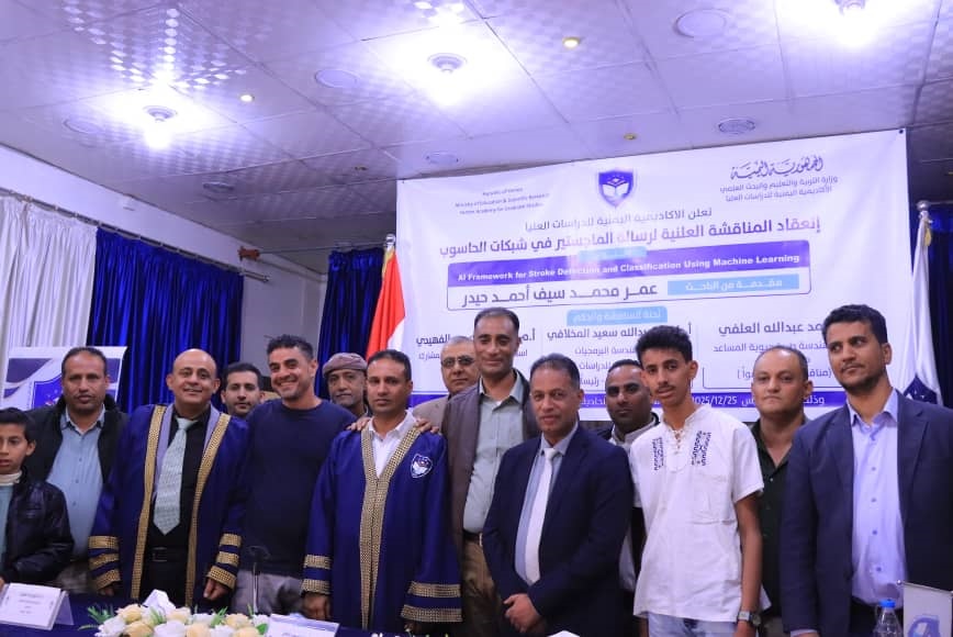 حصل الباحث المهندس/ عمر محمد سيف احمد حيدر على درجة الماجستير بامتياز من الأكاديمية اليمنية للدراسات العليا في شبكات الحاسوب عن رسالته الموسومة “استخدام تقنيات الذكاء الصناعي في تشخيص الجلطات الدماغية”.