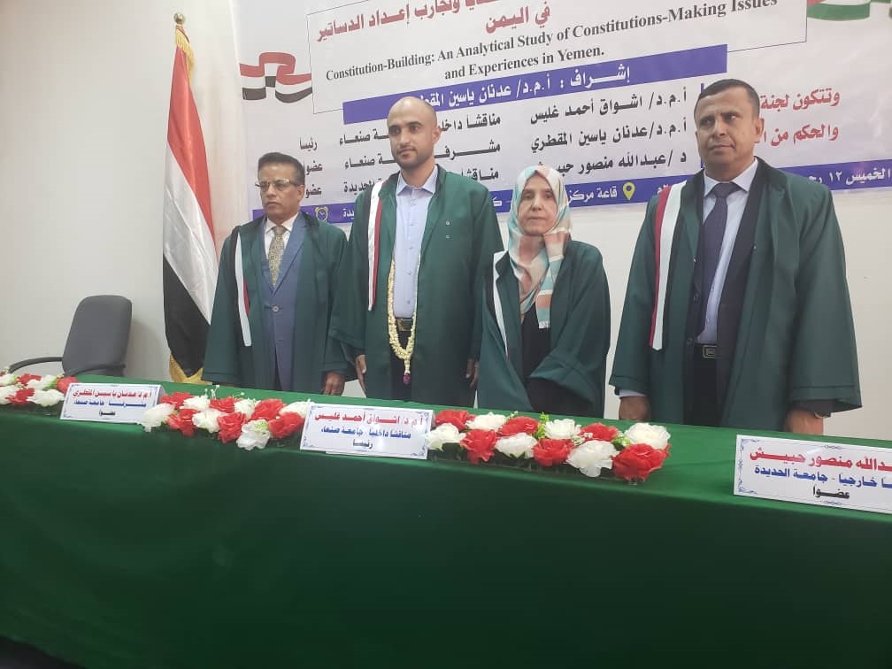 كما أشاد الأستاذ الدكتور عدنان المقطري، المشرف على الرسالة، بتميز الباحث في إعداد دراسته، مؤكدًا أن هذه الرسالة تُعد أول رسالة علمية في اليمن تناولت موضوع بناء الدساتير، وأنها ستكون مرجعًا علميًا رصينًا للراغبين مستقبلًا في إجراء بحوث متعلقة بالدستور في اليمن.