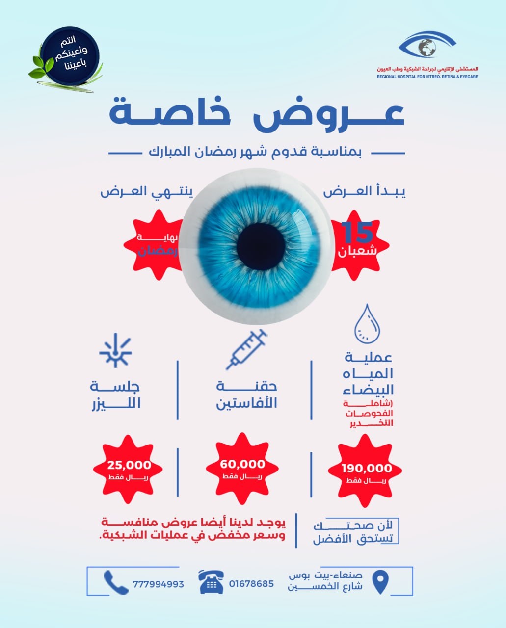 المستشفى الإقليمي لجراحة الشبكية وطب العيون يطلق عروضًا مفاجئة وخصومات كبيرة خلال شعبان ورمضان