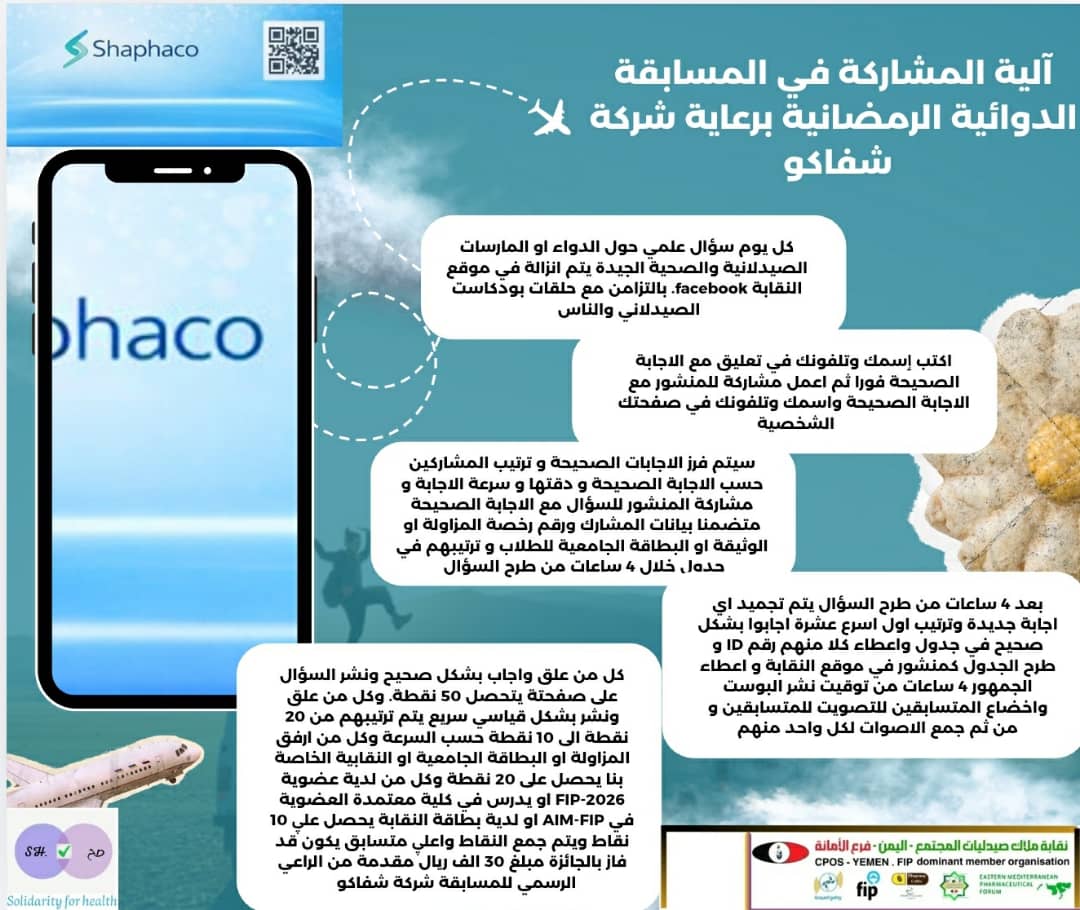 مسابقة دوائية في رمضان الكريم ترافق برنامج بودكاست الصيدلاني والناس برعاية شركة شفاكو ٳعلاميا من منطلق الشراكة المهنية والمسؤولية الاجتماعية وبشروط الالتزام بمواثيق واتفاقيات الترويج الدوائي الاخلاقي وفق الضوابط العالمية لذلك فالشريك الاعلامي لا يسيطر اطلاقا علۑ المحتوۑ العلمي او الاجراءت المتعلقة بالنشاط وهذا توجه رائع من الراعي الاعلامي لنقل التكنولوجيا الترويجية الحديثة Promotional Technology Transfer القائمة علۑ الشراكة المهنية  في خدمة المجتمع & code of conducts in drug promtion  .