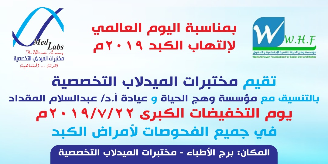 وأوضح الدكتور المقداد أنه في هذه الايام نحن نعايش اليوم العالمي لامراض الكبد وفي هذا اليوم من كل عام لدينا الانشطة المجتمعية في التوعية والمعاينة والفحوصات و العلاج المجانية وكذلك نتواصل مع بعض المختبرات بتقديم الخدمات الطبية باسعار مخفضة جدا.
