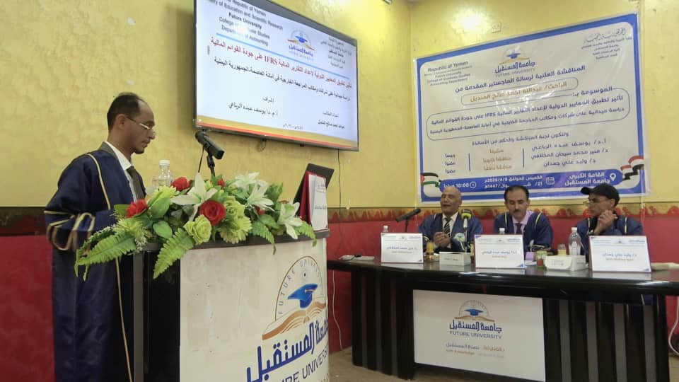 نال الباحث عبدالله احمد صالح المنديل اليوم درجة الماجستير بإمتياز في المحاسبة من كلية الدراسات العليا بجامعة المستقبل عن رسالته الموسومة ب-” تأثير تطبيق المعايير الدولية لإعداد التقارير المالية IFRS على جودة القوائم المالية دراسة ميدانية على شركات ومكاتب المراجعة الخارجية في أمانة العاصمة “.