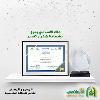 منحت ادارة المؤتمر والمعرض الثاني للطاقة الشمسية في اليمن كاك بنك الإسلامي, شهادة شكر وتقدير؛ وذلك لمشاركته ومساهمته المميزة والفاعلة في إنجاح المعرض, الذي أقيم خلال الفترة من 10-16 يوليو الجاري 2019م, الذى تكلل بنجاح كبير.