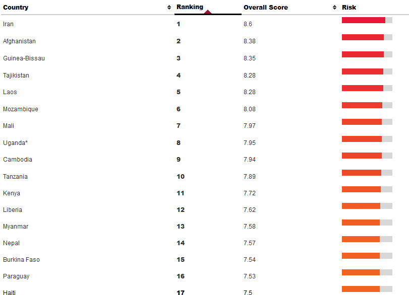ووفقا لتصنيف مؤشر “بازل” لمكافحة غسيل الأموال الذي يصدره معهد بازل للحوكمة في سويسرا، جاءت إيران التي يضم سوقها 80 مليون مستهلك في المرتبة الأولى بالتصنيف، متقدمة على دول أخرى كأفغانستان التي حلت بالمرتبة الثانية، وغينيا، وطاجكستان، وموزمبيق التي حلت بالمراتب الثالثة والرابعة والخامسة على الترتيب.